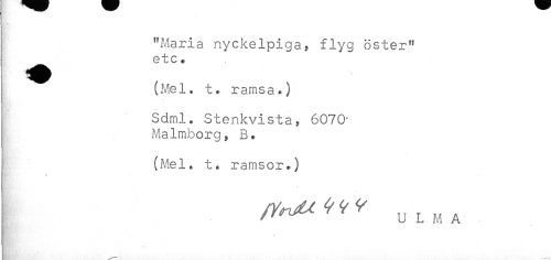 //// "?4arla nyckelpiga, flyg öster" //// etc. //// (l^el. t, ramsa.) //// j. //// Sdml. Stenkvista, 6070* //// Malmborg, B, //// K/'-, //// [ (Mel, t. ramsor.) //// y — //// ULMA ////