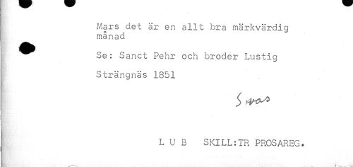 //// Mars det är en allt bra märkvärdig //// månad //// ^^ Se: Sanct Pehr och broder Lustig //// Strängnäs 1851 //// L U B SKILL:TR PROSAREG. ////