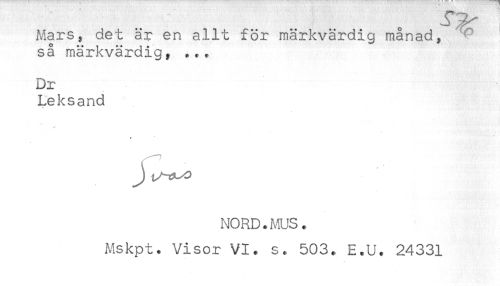 //// Mars, det är en allt för märkvärdig månad, //// så märkvärdig, ... //// Dr //// Leksand //// NORD.MUS. //// Mskpt. Visor VI. s. 503. E.U. 24331 ////