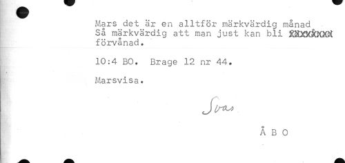 //// Mars det ar en alltför märkvärdig månad //// Så märkvärdig att man just kan bli //// förvånad. //// 10:4 BO. Brage 12 nr 44. //// Marsvisa. ////