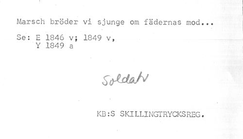 //// ! //// i //// Marsch bröder vi sjunge om fädernas mod... //// I //// Se: E 1846 v; 1849 v, //// Y 1849 a //// * //// < //// KB:S SKILLINGTRYCKSREG. ////