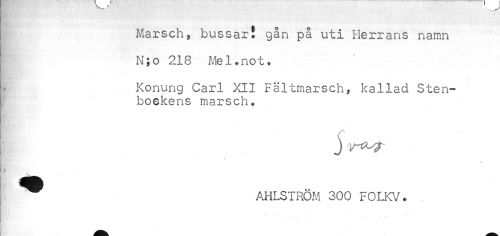 //// Marsch, bussar! gån på uti Herrans namn //// N;o 218 Mel.not. //// i Konung Carl XII Fältmarsch, kallad Sten- //// bockens marsch. //// j //// - //// ^^ AHLSIRÖM 300 FOLKV. //// ^ - . * . ^ — ^ ////