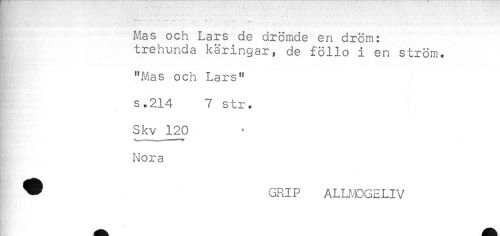 //// * //// Mas och Lars de drömde en dröm: //// trehunda käringar, de föllo i en ström, //// "Mas och Lars" //// s.214 7 str. //// Skv 120 //// Nora //// ^ GRIP ALLMOGELIV ////