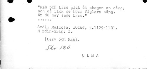 //// I "Mas och Lars gick åt skogen en gång, //// I och då fick de höra fåglars sång. //// Ar du mä? sade Lars." //// I Smdl. Mellösa, 10166, s.1129-1131, //// N rdin-Grip, 1. //// (Lars och Mas). //// ULMA ////