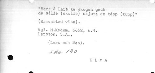 //// "Mars å Lars te skogen geck //// de sålle (skulle) skjuta en tapp (tupp)" //// (Ramsartad visa). //// Vgl. N.Kedum, 6652, s.4. //// Larsson, S.A., //// (Lars och Mas). //// ^ U L M A ////