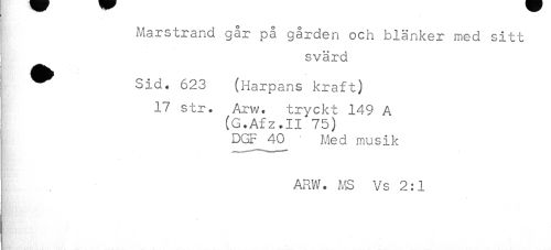 //// Marstrand går på gården och blänker med sitt //// svärd //// ^ Sid. 623 (Harpans kraft) //// 17 str. Arw. tryckt 149 A //// (G.Afz.II 75) //// I DGr_ 40_ Med musik //// I. ARW. ATS Vs 2:1 //// § //// V. //// <1 ////