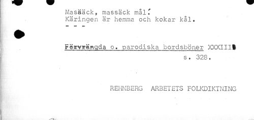 //// Masääck, massäck målf //// Käringen är hemma och kokar kål. //// ! //// Pe^vyäRgda o. parodiska bordsböner XXXI11$ //// s. 328. //// i //// . //// REHNBERG ARBETETS FOLKDIKTNING //// * ////
