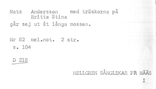 //// - //// Mats Andersson med träskorna på //// Britta Stina //// t //// går sej ut åt långa mossen. //// < //// ! //// j //// Nr 82 mel.not. 2 str. //// i //// ) //// s. 104 //// Djns //// < //// HELLGREN SÅNGLEKAR FR NÄÄS ////