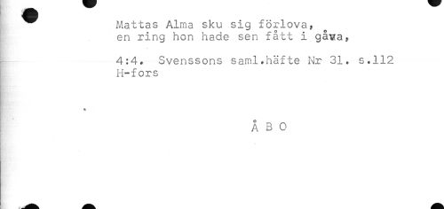 //// Mattas Alma sku sig förlova, //// en ring hon hade sen fått i gåiaa, //// 4:4. Svenssons saml.häfte Nr 31.. s.112 //// H-fors //// ! ÅBO ////
