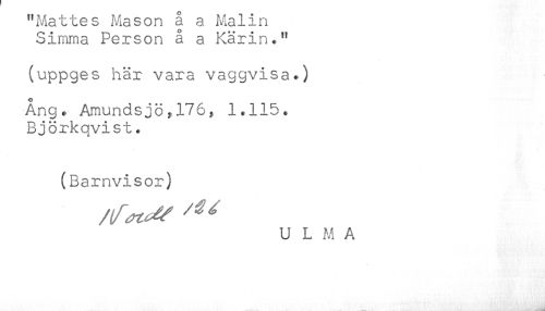 //// "Mattes Mason a a Malin //// Simma Person å a Karin." //// (uppges här vara vaggvisa.) //// Ång. Amundsjö,176; 1.115* //// Björkqvist. //// (Barnvisor) //// ULMA ////