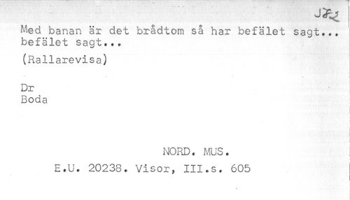 //// Med banan är det brådtom så har befälet sagt... //// befälet sagt... //// (Rallarevisa) //// * ' ) //// Dr //// Boda //// NORD. ms. //// E.U. 20238. Visor, III.s. 605 //// i //// ! //// W ) ////