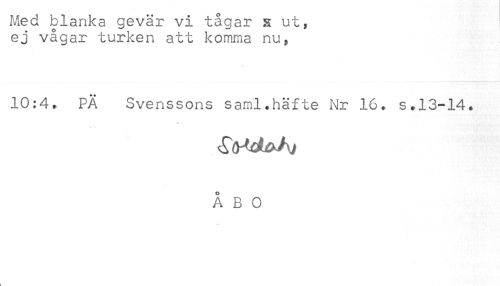 //// Med blanka gevär vi tågar s ut, //// ej vågar turken att komma nu, //// 10:4. PÄ Svenssons saml.häfte Nr 16. s.13-14. //// * * //// ÅBO ////