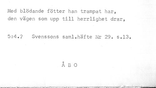 //// Med blödande fötter han trampat har, //// den vägen som upp till herrlighet drar, //// 5:4.? Svenssons saml.häfte Nr 29. s.13. //// ! //// ÅBO ////