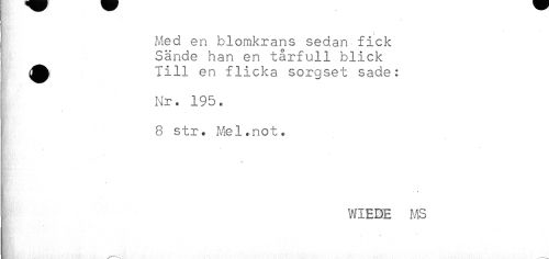 //// Med en blomkrans sedan fick //// ! Sände han en tårfull blick //// § Till en flicka sorgset sade: //// Nr. 195. //// j //// ; 8 str. Mel.not. //// < //// * //// WIEDE MS ////