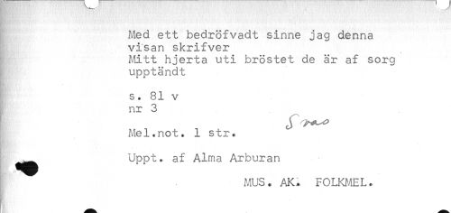 //// Med ett bedröfvadt sinne jag denna //// visan skrifver //// Mitt hjerta uti bröstet de är af sorg //// upptändt //// s. 81 v //// nr 3 //// A^el.not. 1 str. //// ^^^ Uppt. af Alma Arburan //// MUS. AK.* FOLKEL. //// . ////