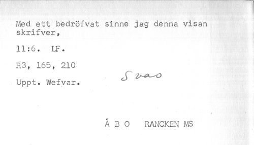 //// Med ett bedröfvat sinne jag denna visan //// skrifver, //// 11:6. LF. //// R3, 165, 210 //// J //// Uppt. Wefvar. //// ÅBO RANCKEN A^S ////