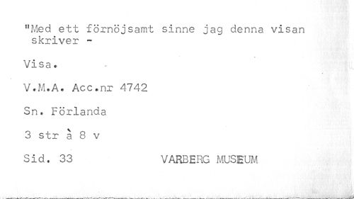 //// "Med ett förnöjsamt sinne jag denna visan //// skriver - //// Visa. //// V.M.A* Acc.nr 4742 //// Sn. Förlanda //// 3 str a 8 v //// Sid. 33 VARBERG MUSEUM ////