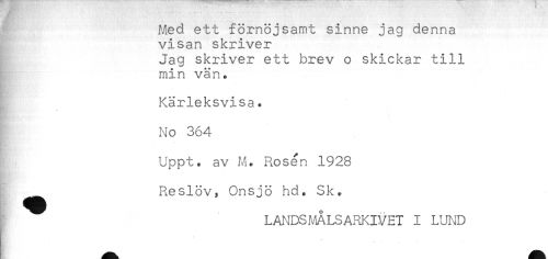 //// Med ett förnöjsamt sinne jag denna //// visan skriver //// Jag skriver ett brev o skickar till //// min vän. //// Kärleksvisa. //// No 364 //// Uppt. av M. Rosen 1928 //// Reslog Onsjö hd. Sk. //// LANDSMÅLSARKIVET I LUND ////