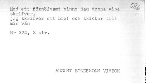 //// Med ett förnöjsamt sinne jag denna visa //// skrifver, //// jag skrifver ett bref och skickar till //// min vän //// Nr 324, 3 str. //// AUGUST BONDESONS VISBOK ) //// a ////