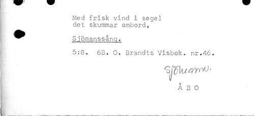 //// Med frisk vind i segel //// det skummar ombord, //// ^^ Sjömanssång * //// 5:8. 6B. O. Brandts Visbok, nr.46. //// ÅBO ////