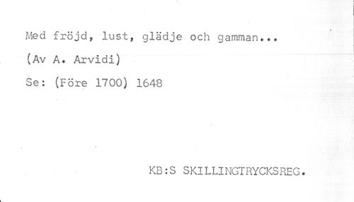 //// Med fröjd, lust, glädje och gamman... //// (Av A. Arvidi) //// Se: (Före 1700) 1648 //// KB:S SKILLINGIRYCKSREG. //// k ////