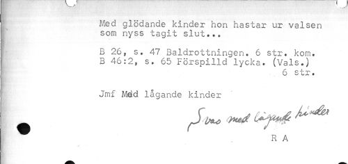 //// Med glödande kinder hon hastar ur valsen //// som nyss tagit slut... //// ] B 26, s. 47 Baldrottningen. 6 str. kom. //// j B 46:2, s. 65 Förspilld lycka. (Vals.) //// 6 str. //// Jmf Mdd lågande kinder ////
