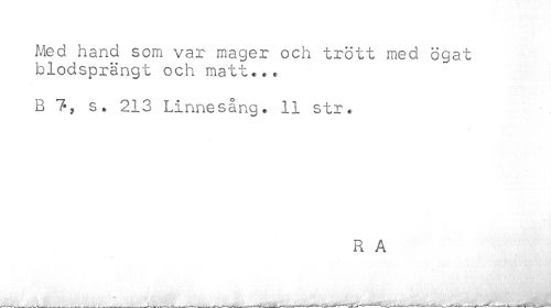 //// Med hand som var mager och trött med ögat //// hlodsprängt och matt.., //// B s. 213 Linnesång. 11 str. //// R A ////