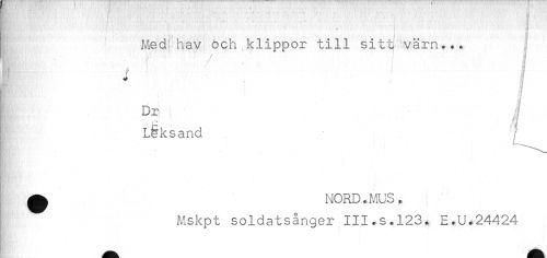 //// Medi hav och klippor till sittj värn... //// Dr J //// ^ a //// Leksand f //// ^Bsr/^;'' ' //// - //// i . //// ^ NORD.MUS. //// Mskpt soldatsånger III.s.123. E.U.24424 ////