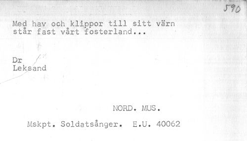 //// ^ 7P //// ... , - ..--*.* //// Med hav och klippor till sitt värn //// står fast vårt fosterland... //// Dr //// Leksand //// < //// NORD. MUS. //// Mskpt. Soldatsånger. E.U. 40062 ////
