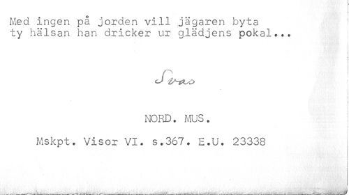 //// r //// < //// Med ingen på jorden vill jägaren byta //// ty hälsan han dricker ur glädjens pokal... ! //// i //// ! //// f //// NORD. ms. //// ' //// Mskpt. Visor VI. s.367. E.U. 23338 ////