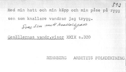//// J y J //// Med min hatt och min käpp och min påse på rygg //// sen som knallare vandrar jag trygg. //// Gesällernas vandr.visor XXIX s.320 //// REHNBERG ARBETETS FOLi<DIKINING //// { //// ! ////