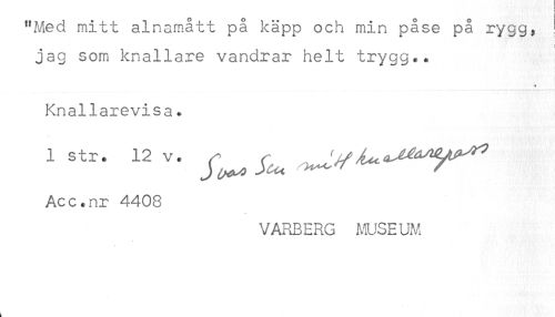 //// "Med mitt alnamått på käpp och min påse på rygg, ! //// t //// jag som knallare vandrar helt trygg.. //// * //// Knallarevisa * //// Acc.nr 4408 //// VARBERG MUSEUM ////