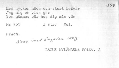 //// Med mycken möda och stort besvär //// Jag mig en visa gör //// Som gömmas bör hos dig min vän //// Nr 753 1 str. Mel. //// * //// Fragm. //// LAGUS NYLÄNDSKA FOLKV. 3 ////