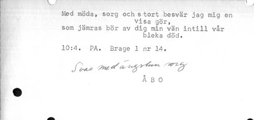 //// Med möda, sorg och stort besvär jag mig en //// visa gör, //// som jämras bör av dig min vän intill vår //// bleka död. //// 10:4. PA. Brage 1 nr 14. //// o //// A B 0 ////