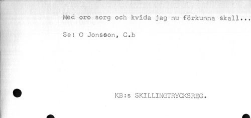 //// - ..... //// Med oro sorg och kvida jag nu förkunna skall.. //// Se: O Jonseon, C.b //// . //// ^ KB:s SKlLLINGTRYCKSREG. ////
