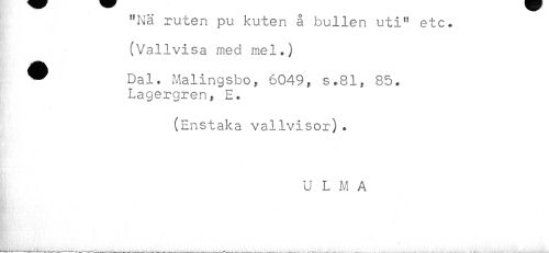 //// "Nä ruten pu kuten å bullen uti" etc. //// (Vallvisa med mel.) //// * Dal. Malingsbo, 6049, s.81, 85. //// Lagergren, E. //// (Enstaka vallvisor). //// U L M A //// ... ^ . ////