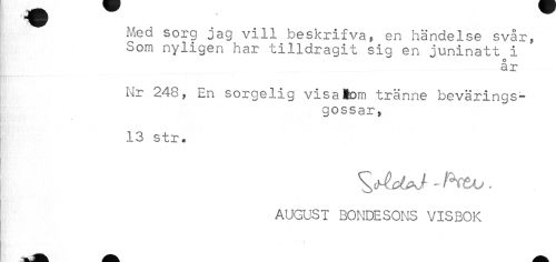 //// Med sorg jag vill beskrifva, en händelse svår, //// Som nyligen har tilldragit sig en juninatt i //// O //// ar //// Nr 248, En sorgelig visatom tränne bevärings- //// gossar, //// 13 str. //// AUGUST BONDESONS VISBOK ////