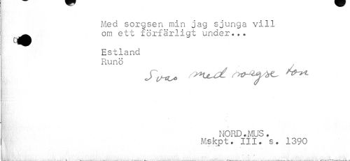 //// Med sorgsen min jag sjunga vill //// ^^^ om ett förfärligt under... //// I Estland //// j Runö //// NORD. ?&JS. //// Mskpt. III. s. 1390 ////