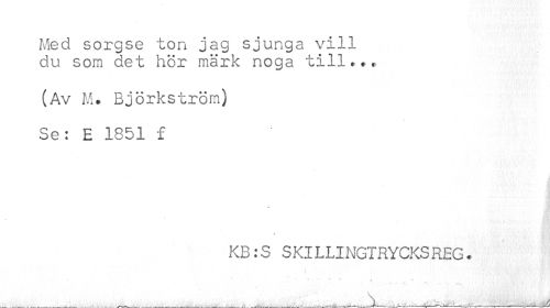 //// Med sorgse ton jag sjunga vill //// du som det hör märk noga till**, //// (Av M. Björkström) //// Se: E 1851 f //// KB:S SKILLINGTRYCKSREG< //// * * * * ..... ** ? * ////