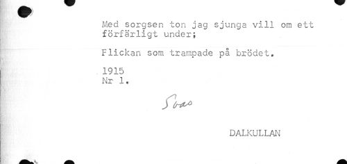 //// Med sorgsen ton jag sjunga vill om ett //// förfärligt under; //// Flickan som trampade på brödet. //// 1915 //// Nr 1. //// DALKULLAN ////
