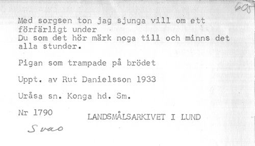//// Med sorgsen ton jag sjunga vill om ett //// förfärligt under ; //// Du som det hör märk noga till och minns det //// alla stunder. //// Pigan som trampade på brödet //// Uppt. av Rut Danielsson 1933 //// Uråsa sn. Konga hd* Sm. //// Nr 1790 ° //// LANDSA^ALSARKIVEI I LUND ////