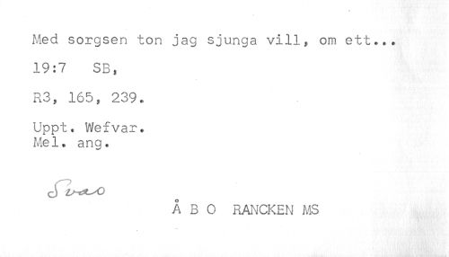 //// Med sorgsen ton jag sjunga vill, om ett... //// 19:7 SB, //// R3, 165, 239. //// Uppt* Wefvar. //// Mel. ang. //// ÅBO RANCKEN MS ////