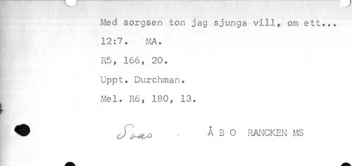 //// Med sorgsen ton jag sjunga vill, om ett... //// 12:7. MA. //// R5, 166, 20. //// ^ Uppt. Durchman. //// Mel. R6, 180, 13. //// ^ ÅBO RANCKEN MS //// k * ////