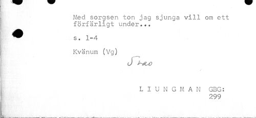 //// } Med sorgsen ton jag sjunga vill om ett //// j förfärligt under... //// ^^ s. 1-4 //// Kvänum (Vg) //// J //// L I U N G A N GBG: //// 299 //// ._____ ////