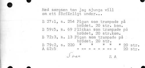 //// B 27:1? s. 254 Pigan som trampade på //// brödet. 20 str. kom. //// B 59:5, s. 69 Flickan som trampade på //// brödet? 20 str.kom. //// B 72:3? s. 13 Pigan som trampade på //// ! brödet. 20 str. //// B 79:2? s. 220 " " " " " 20 str. //// A 62:5 ----- 20 str. //// J ^^ R A ////