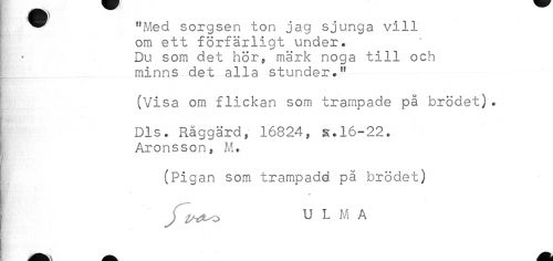 //// ^ "Med sorgsen ton jag sjunga vill //// om ett förfärligt under. //// ! - Du som det hör? märk noga till och //// ! minns det alla stunder." //// r //// (Visa om flickan som trampade på brödet). //// Dis. Råggärd, 16824? a.16-22. //// [! Aronsson? M. //// (Pigan som trampadd på brödet) //// f^D U L M A ////