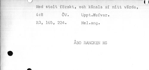 //// Med stolt förakt, och känsla af mitt värde, //// 6:8 ÖV. Uppt.Wefvar. //// R3, 165, 224. Mel.ang. //// ÅBO RANCKEN MS ////