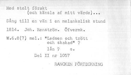 //// Med stolt förakt //// (och känsla af mitt värde)... //// Sång till en vän i en melankolisk stund //// 1814. Joh. Renström. Öfvermk. //// W.6.8(7) mel.: "Ledsen och trött //// och skakad" ? //// lån ? s. //// Del II nr 1057 //// - RANCKEN FÖRTECKNING ////