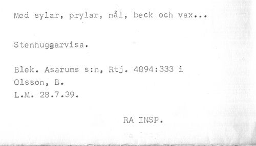 //// Med sylar, prylar: nål, beck och vax... //// Stenhuggarvisa. //// Blek. Asarums s:n, Rtj, 4894:333 i //// Olsson, B. //// L.M. 28.7.39. ////