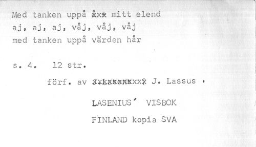 //// Med tanken uppå åxR mitt elend //// aj, aj, aj^ våj, våj, våj //// med tanken uppå värden hår //// . //// t //// s. 4, 12 str. ! //// t //// < //// < //// förf. av gxRBKKHKXxR J. Lassus ' //// LASENIUS ^ VISBOK //// FINLAND kopia SVA //// < //// < ////